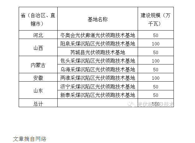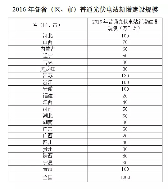 近日,国家能源局下达了2016年光伏发电建设实施方案。方案中,全国新增光伏电站建设规模1810万千瓦,其中,普通光伏电站项目1260万千瓦,光伏领跑技术基地规模550万千瓦。各省(区、市)2016年普通光伏电站新增建设规模和光伏领跑技术基地规模见下表。