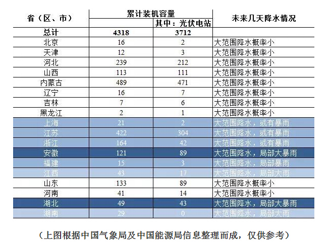 上图中蓝色越深,可能受到强降水及洪涝带来的影响越大。在强降水地区中,江苏省2015年累计地面电站装机容量为304万千瓦时,安徽省89万千瓦时,云南省63万千瓦时,湖北省43万千瓦时,发生地面电站浸水的风险较大,这些省份的地面电站业主要格外注意防护。