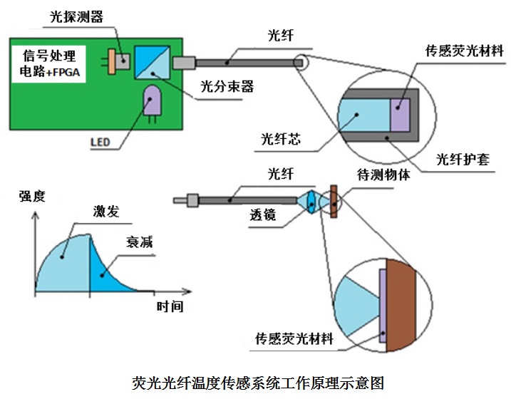 荧光光纤温度传感系统是由荧光式光纤温度传感器和荧光光纤测温仪组成,它是基于纯光学原理,通过荧光材料的温度特性来进行测温的。荧光光纤温度传感器探头是由多模光纤和在其顶部安装的荧光物体(膜)组成。荧光物质在受到一定波长的光的激励后,受激辐射出荧光。激励撤消后,荧光余辉的持续性只取决于荧光物质特性和环境温度这两个因素。这种受激发荧光通常是按指数方式衰减的,我们称衰减的时间常数为荧光寿命或荧光余辉时间(一般以纳秒ns为单位)。