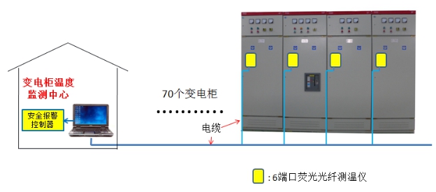 每个变电柜门上荧光光纤测温仪的输出电信号,通过单芯电缆汇入多芯电缆次干线-主干线,较后通入(发电站/大型送变电站)变电柜的温度监控中心。